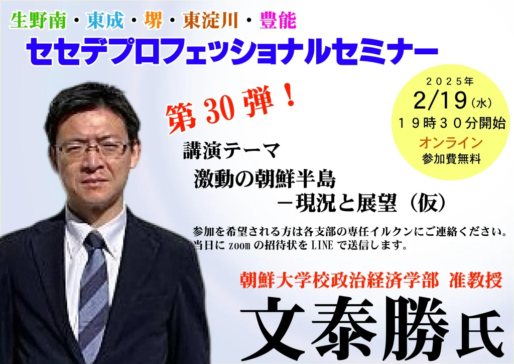 2/19(水)【総聯生野南支部&総聯東成支部&総聯堺支部&総聯東淀川支部&総聯豊能支部 <第30回セセデプロフェッショナルセミナー>(講師:文泰勝)】