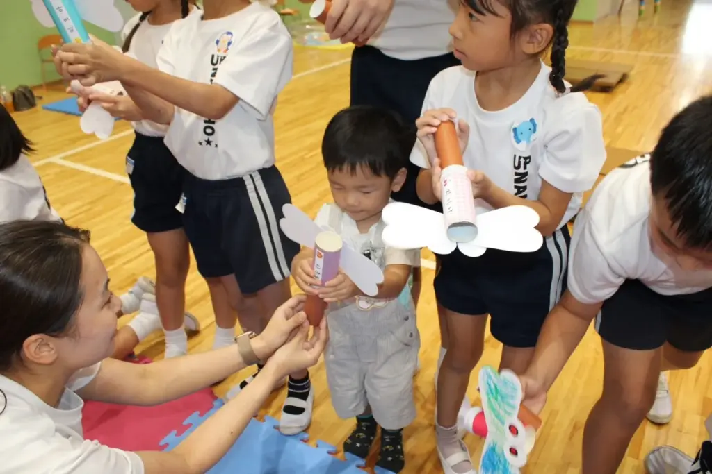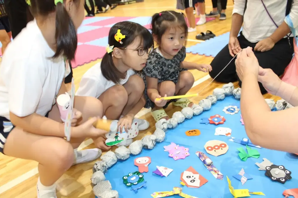 在校生達による手遊び歌や体操などの歓迎公演、とんぼ製作、色々な遊びコーナーなど、チームを組んで楽しく過ごしました。